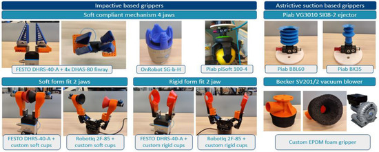 According to Monkman et al. and Shintake et al., the benchmarked grippers can be divided into two categories as follows: impactive based grippers and astrictive pneumatic suction-based grippers [20,21]. The impactive based grippers generate a gripping force by either friction or form closure of the gripping elements (fingers) contacting the object. The astrictive based grippers generate a gripping force through the creation of a negative pressure field between the gripper and the object. Both categories can be divided further into subcategories, based on the design of the fingers and the method of vacuum generation. Figure 1 below provides an overview of the range of tested grippers. The dark blue boxes indicate the gripper category, the light blue boxes indicate the finger design or type of vacuum generation, and the grey boxes describe the basic components of the gripper.