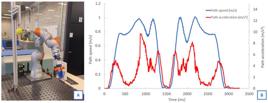 The used testing setup with the KUKA iiwa 14 R820 (A) and Velocity and acceleration diagram of the end effector along the movement path during one testing sequence (B).