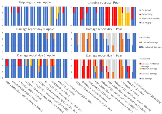 Synthesis of the test results: left are the results for apples, and right for pears. For each gripper tested, the three force settings, defined between brackets, are displayed in three separate columns.