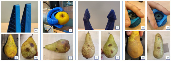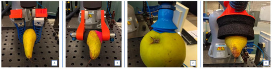This testing sequence was performed on each gripper for both apples (Cultivar: Golden Delicious) and pears (Cultivar: Conference) on three gripping force settings and each of these tests was repeated thrice for validation (Figure 3). This resulted in nine tested apples and nine tested pears per gripper. The three gripper force settings were set at the lower range, midrange and maximum range of the manipulation tools force range and are described for each tool in Figure 3. The repetitions of each testing scenario had to be reduced to three tests due to the combination of a large range of testing scenarios, the absence of sufficient testing subjects with consistent characteristics, and the limited duration over which the tests could be executed. This time span needed to be minimized to limit the variation in the condition of the fruit, which could change rapidly due to the fruit being untreated. Despite the reduced number of repetitions, which limits the statistical relevance, the testing results still provide relevant insights in the capabilities of the manipulation tools as clearly defined patterns further described in Section 3. A larger testing batch for the best performing tools will be a subsequent step in future work. The actuation speed of the grippers was minimized, reducing the impact force of the closing gripper. Thus, the damage caused to the fruits could be evaluated as solely influenced by the grippers’ design and the gripping force. The fixed gripping position in combination with the size and shape variation of the fruit caused some planned deviation from the ideal gripping position. This deviation gave useful insights regarding the grippers’ abilities to cope with similar realistic scenarios, such as moving branches or detection errors.