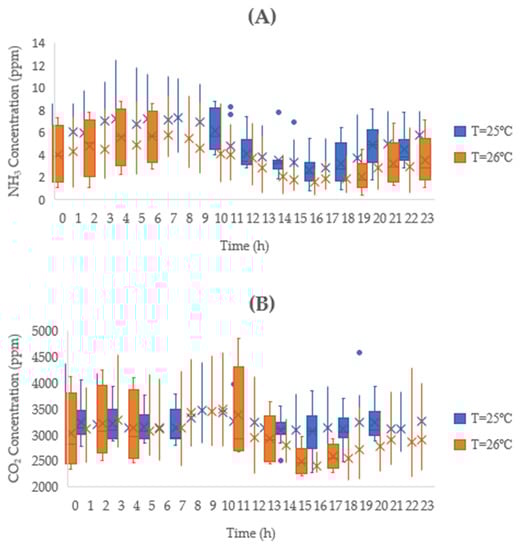 For both setpoint temperatures, daily mean NH3 concentrations (Figure 2) were well below the strict safe exposure limits set by [11] at 10 ppm, and most of the time below the 7 ppm established by [16]. Piglets were in a clean environment, with concentrations below 6 ± 0.5 ppm [12], for 85.32% and 66.67% of the time for 26 and 25 °C, respectively, and exceeded this limit only for 14.68% (26 °C) and 33.33% (25 °C) of the time.