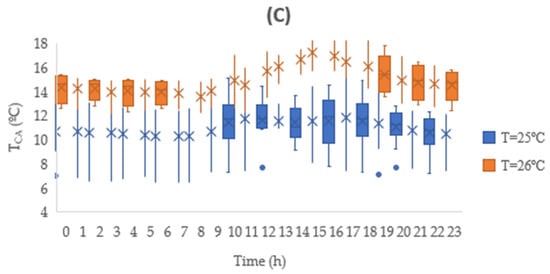 For both TS, a negative correlation was found between NH3 and TCA, with higher values for 26 °C (−0.80) than for 25 °C (−0.29), which is in agreement with [20]. This effect can be explained by the ventilation rates [32]. When the outdoor temperatures drop, there is a decrease in the ventilation rate inside the building, with the consequent increase in NH3 concentration. This has been confirmed in our study, with correlations between ventilation (VEX) and NH3 of −0.72 and −0.65 for 26 and 25 °C, respectively.