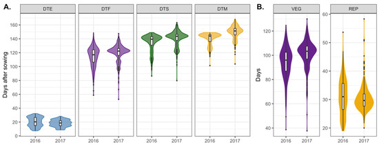 Variation in (A) Days to: emergence (DTE), flowering (DTF), swollen pod (DTS), maturity (DTM) from seeding, and (B) vegetative period (VEG) and reproductive period (REP) of 324 genotypes grown in the winter of 2016 and 2017 at Bardiya, Nepal. The width of a plot indicates the density distribution, and the whiskers on the box plots represent 1.5 times the quartile of the data. Individuals falling outside the range of the whiskers are represented as black dots.