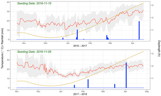 Variation in temperature (°C), rainfall (mm), and daylength (h) during field experiments in 2016 (top) and 2017 (bottom). The X-axis represents the months of the field experiments, and Y-axis represents temperature, rainfall (precipitation), and daylength. The red line in both plots is the average temperature, and the grey shadow around it is maximum and minimum temperature. The yellow line is daylength, and blue bars are the amount of rainfall on a particular day.