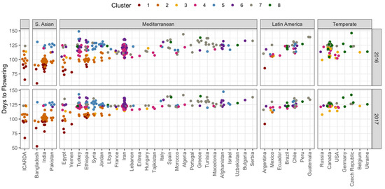 Days to flowering (DTF) of 324 genotypes grown in the winter of 2016 and 2017 at Bardiya, Nepal, based on their country and geographical region of origin. Different colored dots represent genotypes from eight different clusters derived from principal component analysis and hierarchical clustering from Wright et al. [4]. Genotypes from the ICARDA breeding program were kept separate, as they are a mix of germplasm from a large breeding program.