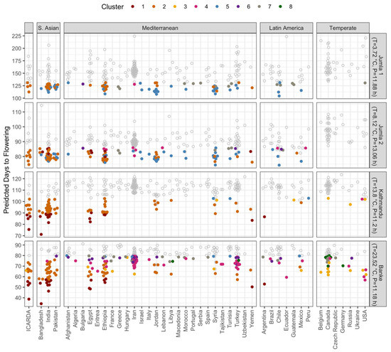 Predicted days to flowering (DTF) of 324 genotypes if grown at Banke, Kathmandu, and Jumla as the representative of the major agricultural growing regions, e.g., the terai, mid-hill, and high hill of Nepal, derived from a photothermal model from the study by Wright et al. [4] using in-season average temperature (T) and photoperiod (P) of each environment. Jumla 1 would represent an early winter sowing date, whereas Jumla 2 would represent an early spring sowing date. The genotypes that should have appropriate phenology based on the photothermal model are represented by colored points based on their membership in different clusters. For prediction, the maximum DTF from cluster 2 of the South Asian genotypes was considered a cut-off for Banke and Kathmandu and the maximum from cluster 5 as the cut-off for Jumla.