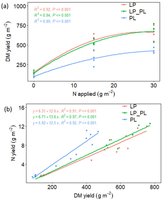 Graphs showing (a) the dry matter (DM) yield of pastures in response to varying N rates and (b) the linear relationships between the DM yield and nitrogen yield affected by the different swards.