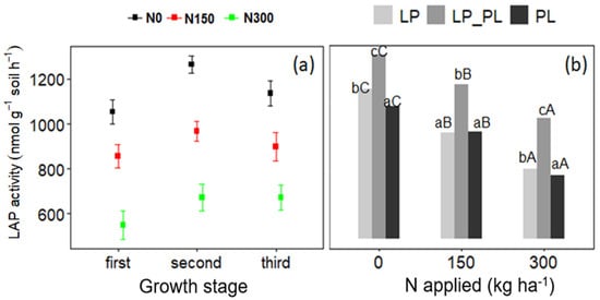 Graphs showing leucine aminopeptidase (LAP) expression in fertilized soils cultivated with forage species as affected by (a) the stage of growth and (b) sward type. Lowercase and uppercase letters represent significant differences between the sward types and the N rate, respectively. LP represents Lolium perenne; PL represents Plantago lanceolata.