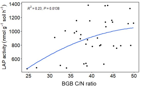 The swards’ structural and functional differences affected LAP expression in the soils, which reflected in a higher enzyme activity associated with the mixed swards relative to the monoculture swards at all N fertilization rates. This trend might be due to the high exudation associated with mixed-species communities and the consequent stimulation of microbial activity [48]. Root exudates are the primary source from which soil microbes derive energy for biomass production [49]. Furthermore, it was found that a positive association existed between LAP expression and BGB C/N ratio (Figure 3). A positive association between increased root biomass, root exudates and microbial biomass and increased species richness has been previously reported [50,51]. Prommer et al. [52] reported a direct relationship between root biomass, microbial growth and microbial biomass carbon. Thus, a higher C availability belowground might have stimulated microbial growth [53]. This observation might explain why there appeared to be an increased LAP activity associated with the increasing growth stage and the mixed swards (Figure 2a). However, soil microbial communities can also affect the amount and composition of root exudates [54]. Sørensen et al. [55] contended that various plant organic compounds affect the structure, abundance and microbial activity. Thus, more diverse exudates would stimulate a higher microbial diversity [56] and alter extracellular enzyme expression.
