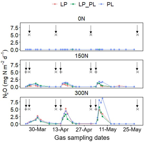 Graphs showing daily N2O fluxes from the diverse swards at different fertilization rates. LP represents Lolium perenne; PL represents Plantago lanceolate. Arrows with + represent fertilizer application events, and arrows with x represent a biomass harvesting event.