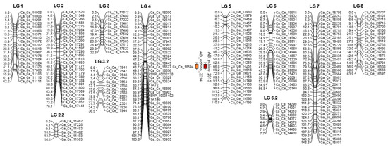 To identify SNPs in the RIL mapping population, capture-based and GBS-t sequencing approaches were performed. In the capture-based approach, sequencing generated a total of 48,503,448 paired end reads with an average of 350,000 reads per line. Most of the probes (10,732; 95%) were identified as being on-target sequences with reads distributed evenly across all targeted regions. Among them, 55% of the probes (5854) were polymorphic between the two RIL parents. A final set of 2479 SNP markers were selected for linkage mapping after additional filtering based on missing data (<20%), heterozygosity (<10%), and χ2 analysis (p < 0.05) (Table S3).