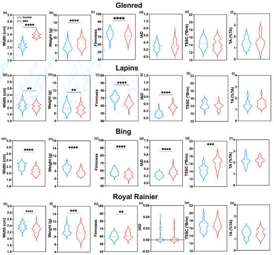 Sweet cherry fruit quality parameters of ABA canopy sprayed trees during the 2017 season. (a–f) ‘Glenred’, (g–l) ‘Lapins’, (m–r) ‘Bing’, and (s–x) ‘Royal Rainier’. Violin plots represent the Kernel density probability distribution of the data, and inner lines indicate the quartile division. In total, 100 fruits from four biological replicates (n= 4 trees, 25 fruits per tree) were used (detailed information in material and methods). Significant differences between ABA treatment and control treatment were performed by an “Unpaired t-test”. Asterisks indicate p-value at: ** < 0.01, *** < 0.001, and **** < 0.0001.
