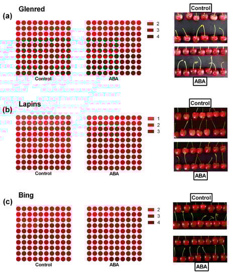 ABA canopy spraying effect on sweet cherry fruit CTIFL scale of cultivars ‘Glenred’, ‘Lapins’, and ‘Bing’ at harvest during 2017 season. (a) ‘Glenred’, (b) ‘Lapins’, and (c) ‘Bing’. The sweet cherry color chart (CTIFL, France) was used to identify changes in color distribution at harvest in response to ABA exogenous canopy spraying treatment. The number 1 indicates the lightest and 4 the darkest red. In total, 100 fruits from n = 4 trees were used (25 fruits per tree). A reference photo at harvest for control and ABA-treated fruits is shown.