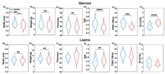 Canopy spraying effect of ABA on sweet cherry fruit quality parameters in the cultivars ‘Glenred’ and ‘Lapins’ during the 2018 season. (a–f) ‘Glenred’ with canopy ABA treatment and (g–l) ‘Lapins’ with canopy ABA treatment. Violin plots represent the Kernel density probability distribution of the data, and inner lines indicate the quartile division. In total, 100 fruits from four biological replicates (n = 4 trees, 25 fruits per tree) were used (detailed information in material and methods section). Significant differences between ABA and control treatment were performed by an “Unpaired t-test”. Asterisks indicate p-value at: ** < 0.01, *** < 0.001, and **** < 0.0001.