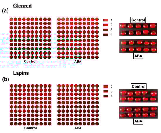 ABA canopy spraying effect on sweet cherry fruit CTIFL scale of cultivars ‘Glenred’ and ‘Lapins’ at harvest during 2018 season. (a) ‘Glenred’ and (b) ‘Lapins’. The sweet cherry color chart (CTIFL, France) was used to identify changes in color distribution at harvest in response to ABA exogenous canopy spraying treatment. The number 1 indicates the lightest and 4 the darkest red. In total, 100 fruits from n = 4 trees were used (25 fruits per tree). A reference photo at harvest for control and ABA-treated fruits is shown.