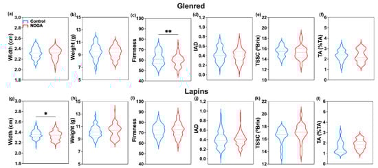 Canopy spraying effect of NDGA on sweet cherry fruit quality parameters in the cultivars ‘Glenred’ and ‘Lapins’ during the 2018 season. (a–f) ‘Glenred’ with canopy NDGA treatment and (g–l) ‘Lapins’ with canopy NDGA treatment. Violin plots represent the Kernel density probability distribution of the data, and inner lines indicate the quartile division. In total, 100 fruits from four biological replicates (n = 4 trees, 25 fruits per tree) were used (detailed information in material and methods section). Significant differences between NDGA and control treatment were performed by an “Unpaired t-test”. Asterisks indicate p-value at: * < 0.05, ** < 0.01.