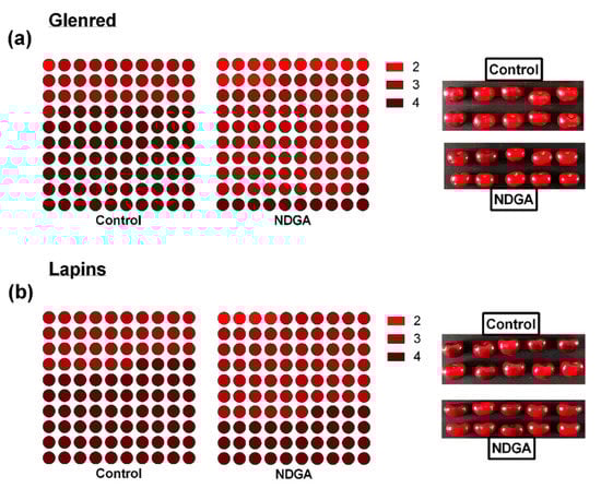NDGA canopy spraying effect on sweet cherry fruit CTIFL scale of cultivars ‘Glenred’ and ‘Lapins’ at harvest during 2018 season. (a) ‘Glenred’ and (b) ‘Lapins’. The sweet cherry color chart (CTIFL, France) was used to identify changes in color distribution at harvest in response to NDGA exogenous canopy spraying treatment. The number 1 indicates the lightest and 4 the darkest red. In total, 100 fruits from n = 4 trees were used (25 fruits per tree). A reference photo at harvest for control and NDGA-treated fruits is shown.