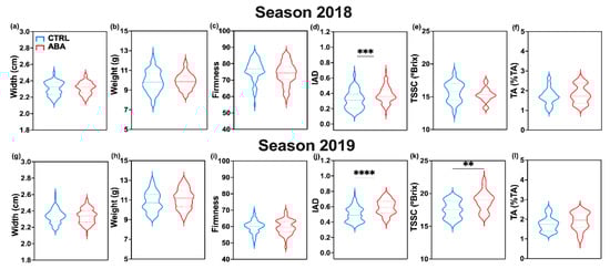 Effects of ABA treatment by “on-tree” dipping on the ‘‘Lapins’’ cultivar. (a–f) Season 2018, and (g–l) Season 2019. Violin plots represent the Kernel density probability distribution of the data, and inner lines indicate the quartile division. In total, 100 fruits from four biological replicates (n = 4 trees, 25 fruits per tree) were used (detailed information in material and methods section). Significant differences between ABA treatment and control treatment were performed by an “Unpaired t-test”. Asterisks indicate p-value at: ** < 0.01, *** < 0.001, and **** < 0.0001.