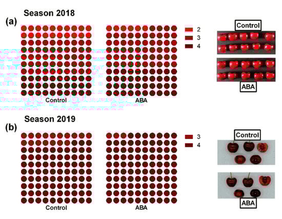 ABA dipping effect on sweet cherry fruit CTIFL scale of ‘‘Lapins’’ cultivar at harvest during seasons 2018 and 2019. (a) Season 2018, and (b) Season 2019. The sweet cherry color chart (CTIFL, France) was used to identify changes in color distribution at harvest in response to ABA “on-tree” fruit dipping treatment. The number 1 indicates the lightest and 4 the darkest red. In total, 100 fruits from n = 4 trees were used (25 fruits per tree). A reference photo at harvest for control and ABA-treated fruits is shown.