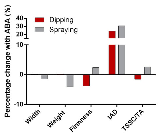 Percentage change of the fruit quality parameters evaluated at harvest in response to ABA treatment for spraying and dipping in 2018 season. Percentage change was calculated as the difference in the parameter between control and treatment (for detailed information see materials and methods section).