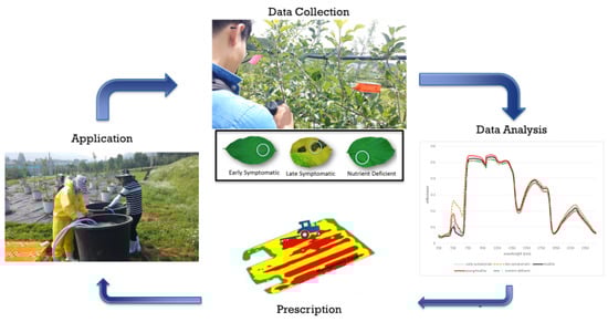 PA follows a cyclical process. The first stage is data collection where data such as disease and pest information, soil characteristics or weather conditions are collected using remote sensing or soil sensors. The information is paired with GIS data to aid in the next steps. The second stage, data analysis, involves developing the classifiers to detect the features of interest, whether that be nutrient content, presence of certain diseases or pests or soil components. The third stage, prescription, is to produce a prescription map from the classified data. This map illustrates how much of an input should be applied throughout the field. The last stage, application, is where the maps are loaded into the application devices, such as fungicide applicators or irrigation devices. The devices are able to vary the amount of input applied according to the prescription. After application, the PA cycle can restart. How often the cycle is used depends on the input. For example, PA is usually applied to irrigation on a weekly or daily basis [18].