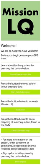 The citizen science platform named “Mission LQ” was created in three versions, based on the feedback from users in the social interviews as published in Posadas B. et al. and wireframe evaluations described in Posadas B.B. et al. [49,50]. Two smartphone applications were built for iOS and Android, and a desktop version for users who do not have a smartphone. The designs for each are described below.