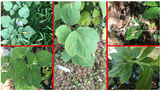Lambsquarters, or pigweed, or goosefoot, is a popular wild edible plant [31,32,33,34,35]. In previous literature, lambsquarters has been spelled “lamb’s quarters” or “lamb’s-quarters”, though the Integrated Taxonomic Information System (ITIS) and the United States Department of Agriculture (USDA) has determined the current naming convention to be “lambsquarters” [36,37]. Its scientific name Chenopodium album L. is derived from chen is Greek for goose, podos for foot, and album for white. These components reference the visual of the plant, as the shape of the leaves resembles a goose’s foot and the underside of the leaves are white, although older plants can take on a reddish color [33,34]. Examples of lambsquarters are in Figure 2.