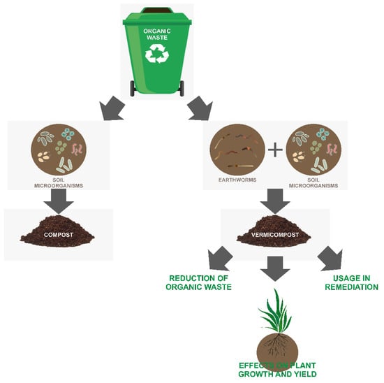 Vermicomposting is a biotechnological process of composting wide ranges of organic waste [12,13,14] that includes specific earthworms’ species that enhance the waste conversion into a very useful high-quality end product known as vermicompost [15,16]. Vermicomposting involves bio-oxidative processes and the stabilization of organic material just as in composting; except in vermicomposting, this includes interactions between earthworms and microorganisms. The role of microorganisms is the production of enzymes that cause the biochemical decomposition of organic matter, while earthworms contribute to a larger microbial population through fragmentation and ingestion of fresh organic material. Besides the above, earthworms also interact with other organisms in the soil and can affect various microflora and microfauna communities [17]. Although vermicomposting and composting have some similarities, there are many significant differences between them, which are highlighted in numerous reviews [18,19,20]. These differences include the lack of the thermophilic phase in vermicomposting during which pathogens are reduced [6], different requirements of moisture content that are higher for vermicomposting and differences of end-product quality where vermicomposting shows more positive effects on the physicochemical properties of the soil and on plant growth [21,22]. The conversion of industrial waste into vermicompost is important for pollution monitoring and controlling, since vermicompost has potential application in remediation and can be used for the reduction of the waste (Figure 1) [23]. Additionally, vermicompost has many beneficial effects on plants including induction of plant growth and yield (Figure 1). Therefore, it is also important for agriculture and horticulture purposes because it is used as fertilizing material [24] but also in terms of sustainable development.
