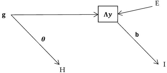 Path diagram of the Smith–Hazel index, in which the rectangle for y refers to a vector of an observable variable (the phenotypic values). The matrix accounts for the causal relationships among traits. The vector of phenotypic values is influenced by the vector of genotypic value (g) and the vector of environment (E). There are also two important parts in the path, the selection index (I), and the merit or breeding value (H).
