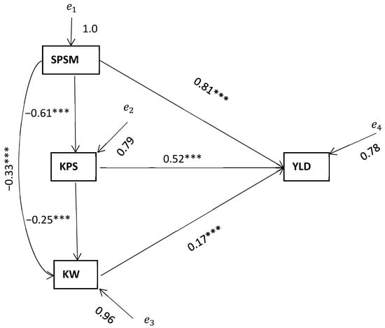 Standardized estimates of path coefficients of a structural equation model of grain yield (YLD) and yield components (spikes per square meter (SPSM), kernels per spike (KPS), and kernel weight (KW)). Arrows represent the direction of the variables’ influence, and the numbers on the arrow lines represent the estimated standardized coefficients. Significant level: ***p ≤ 0.001.