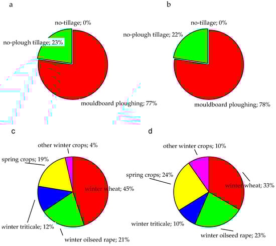 Structure of the tillage systems (a,b) and cultivated plants (c,d) in crop fields with herbicide-resistant (a,c) and susceptible (b,d) populations of Centaurea cyanus L. in two or three successive growing seasons.