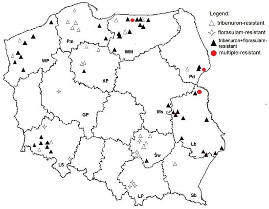 The distribution of locations where herbicide-resistant populations of C. cyanus were found is presented in Figure 2.