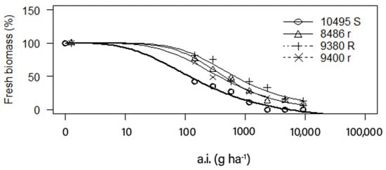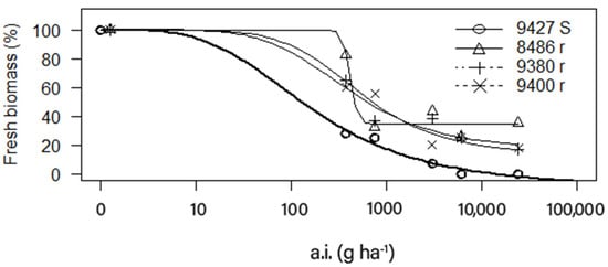 The aim of the whole-plant dose-response bioassay was to establish the ED50 dose, i.e., the dose causing a 50% reduction in the biomass of a herbicide-treated plant. ED50 was calculated using the ‘drc’ package [31] in R ver. 4.0.1 [32]. Dose-response curves were plotted using a logarithmic scale for herbicide dose (X-axis).
