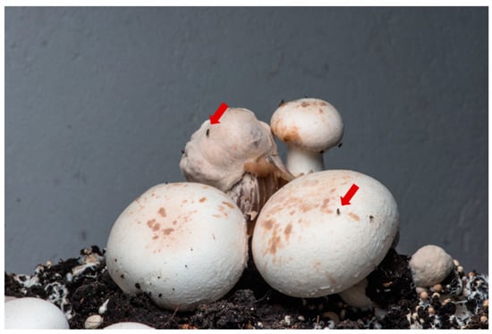 Mushroom crops are susceptible to a variety of pests and diseases that may affect the yield and quality of production [,]. Dipteran species (phorid and sciarid flies) are among the main arthropod pests affecting the cultivation of A. bisporus throughout the world [,,,]. Mushroom yield losses are either directly due to the larvae of mushroom flies feeding on the mycelia or carpophores, or to other pests and diseases vectored by these flies []. Reported evidence points to the transport of spores of different species of pathogenic fungi by mushroom flies [,,,,,,]. Similarly, phorids as well as sciarids were described as vectors of pathogenic mites [,,,].