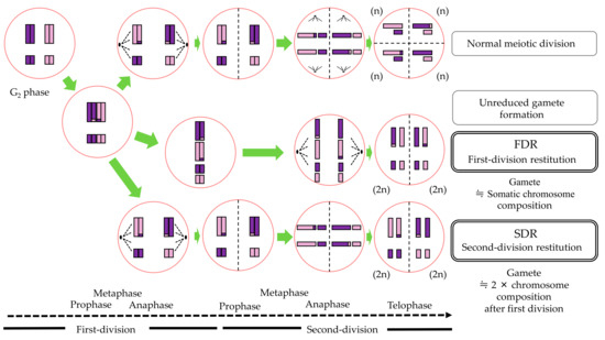 The process of the 2n unreduced gamete formation through two abnormal divisions, FDR and SDR, and the expected chromosome compositions of the 2n unreduced gamete.