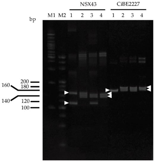 SSR analysis of ‘Kiyomi’ tongor, Meiwa kumquat, and their hybrids with PAGE in NSX43 (LG5) and CiBE2227 (LG8) loci. Arrowheads indicate the bands specific to each parent. M1: 100 bp ladder marker, M2: 20 bp ladder marker, 1: ‘Kiyomi’ tongor, 2: H15-701, 3: H15-702, 4: Meiwa kumquat.