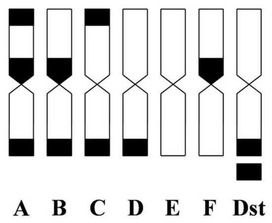 Idiograms of CMA banding patterns according to Yamamoto and Tominaga (2003) and Yamamoto et al. (2007). A = two telomeric bands and one proximal band, B = one telomeric and one proximal band, C = two telomeric bands, D = one telomeric band, E = no band, F = one proximal band, and Dst = type D with a satellite chromosome.