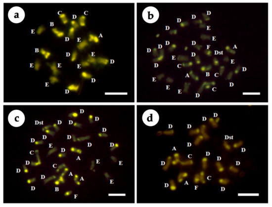 CMA staining of the somatic chromosomes at metaphase in young leaves of ‘Kiyomi’ tangor, Meiwa kumquat, and their hybrids. (a) ‘Kiyomi’ tangor (2n = 2x = 18), (b) H15-701 (2n = 28), (c) H15-702 (2n = 3x = 27), (d) Meiwa kumquat (2n = 2x = 18). A = two telomeric bands and one proximal band, B = one telomeric and one proximal band, C = two telomeric bands, D = one telomeric band, E = no band, F = one proximal band, and Dst = type D with a satellite chromosome. Bar represents 5.0 μm for all figures.