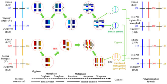 Many reports have found that, as in our result, triploid plants were generated by diploid−diploid sexual crosses [3,4,5,6,7,8,9]. The polyploidization of the progenies had to be a consequence of 2n unreduced gamete formation. As a result, these triploid plants should have had a genome construction with a 1:2 ratio, one reduced gamete and the other unreduced gamete, respectively. The major mechanisms underlying 2n gamete formation in plants are first-division restitution (FDR) and second-division restitution (SDR) resulting from the failure of the first or second meiotic division, respectively [10,11]. The first and second divisions show different chromosome segregation patterns, so FDR and SDR result in different chromosomal modes of inheritance. Several clarifications of sexual polyploidization through meiotic restitution in citrus have been attempted using genetic markers and cytological analyses [12,13,14,15,16].
