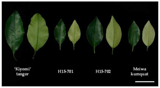 Comparison of morphological characteristics of leaves in ‘Kiyomi’ tangor, Meiwa kumquat, and their hybrids. (Bar = 5.0 cm).