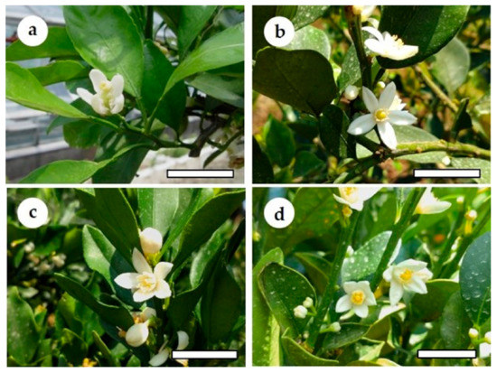 Comparison of morphological characteristics of flowers and flowering habits in ‘Kiyomi’ tangor, Meiwa kumquat, and their hybrids. (a) ‘Kiyomi’ tangor, (b) H15-701, (c) H15-702, (d) Meiwa kumquat. Bars = 2.0 cm.