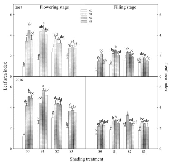 The experiment showed (Figure 1) that LAI at the flowering stage and filling stage both increased first and then decreased with the increase in the shading range. LAI of S1 treatment was significantly higher than other treatments at flowering stage. Compared with S0, S2 and S3 treatments, S1 treatment increased by 14.9–57.4%, 10.8–54.4% and 36.2–117.8%. There was no obvious difference in LAI between S1 and S2 treatments at filling stage, but the LAI of S1 and S2 treatments was significantly higher than that of S0 and S3 treatments. Under the conditions of S0 and S1, LAI first increased and then decreased with the increase in nitrogen application. The LAI of N2 treatment was the highest, and it was 11.8–50.1%, 4.1–73.6% and 78.1–366.9% higher than that of N1, N3 and N0 treatments, respectively; under the conditions of S2 and S3, there was no significant difference in the LAI among different nitrogen treatment at the flowering stage. The LAI at filling stage decreased with the increase in the nitrogen application, and the LAI of N1 treatment was the highest.
