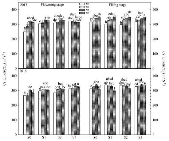 The Ci showed an increasing trend with the increase in the shading range (Figure 5). Under the conditions of S0 and S1, the Ci of N2 and N3 treatment was higher than that of N0 and N1 treatment; under the conditions of S2 and S3, Ci was not affected by nitrogen application.