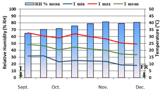 Temperature and relative humidity in the greenhouse during the crop cycle.