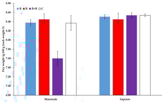 The plants with supplementary LED lighting produced, on average, 19% more than the control, without showing significant differences between spectra (Table 1). The production was also influenced by the cultivar, as ‘Maestrale’ produced almost 20 g/plant more than ‘Saporro’ (Table 1). Similarly, the cultivar influenced the number of pods per plant and the leaf area, with ‘Maestrale’ scoring better results than ‘Saporro’ (Table 1). The height of the plants was modulated by the light, with the plants under LEDs that were higher than those of the control (3 cm on average—Table 1). The dry matter was influenced by both the light treatment and the cultivars, and from their interaction (Table 1). More specifically, the R + B treatments decreased by 11% the dry matter percentage in ‘Maestrale’ with respect to ‘Saporro’ (Figure 2).