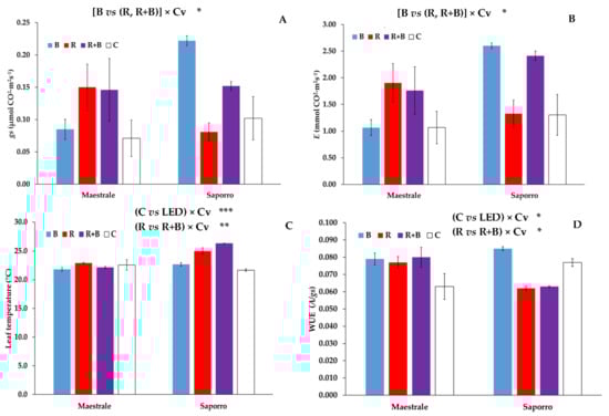 The experimental factors (LEDs and cultivar) were fixed in a two-way analysis of variance (ANOVA), while the technique of orthogonal contrasts was used to establish differences between light means (three contrasts): (I) Control vs. LEDs; (II) R vs. (B and R + B); (III) B vs. R + B.