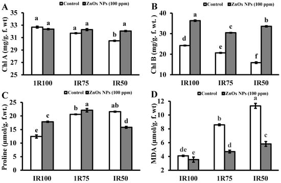 3.8. Effect of Green Synthesized ZnOx NPs on Proline and Lipid Peroxidation (MDA)