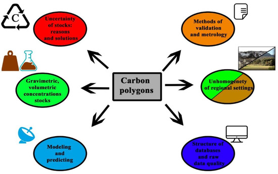 Modeling is a critical tool for predicting and analyzing large amounts of data, including carbon data. Modern mathematical simulation models (Romul, Efimod) allow one to process large amounts of soil–climatic and soil–chemical data to predict the dynamics of the content of various fractions of organic matter, from easily decomposable to highly stabilized [43,45,46,48]. Soil–climatic data are currently in deficit; therefore, a long-term temperature and water content logger should be inserted into the soil, at different depths to provide an automatic meteostation on the soil’s surface. High-accuracy simulation modeling is not only important from the point of view of basic science; it is also important for the forecasting markets of carbon units and carbon offsets. Every type of carbon market should be targeted by a prediction system, such as a mathematical simulation model. This model should be verified using the input data derived from carbon polygons. The use of GIS systems is also crucial for the generalization of big raw data and the visualization of boundless information [51,52].