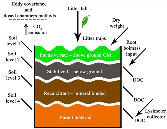 The input of carbon into soil is determined by two flows: aboveground and belowground. The first can be measured by a monthly quantification of litterfall in litter traps, which is quite useful when calculating carbon balance [29]. Below ground input is less costly in terms of time but more difficult to count the living-root biomass. As for the total emission of CO2,the classic method of closed field chambers [30] or the more advanced eddy covariance method are appropriate. The eddy covariance method is based on the measurement of net exchange of CO2 over study area, as well as wind speed, to provide data regarding changes in SOC stocks [4]. The closed field chamber method is manual; therefore, portable CO2 measurement units can be quickly transported and installed at the studied sites. This method is cheap and provides a simple analysis when investigating the carbon budget in an ecosystem, but it cannot cover a large area of investigation sites. Therefore, using the eddy covariance method is the most appropriate option for analyzing a carbon budget. The eddy covariance method allows dynamic data retrieval from a specific carbon landfill over a long period in any conditions (Arctic, Boreal, Tropical, etc.). For the placement of an eddy covariance tower, certain conditions must be observed, such as stable conditions for the polygons (wind, temperature, humidity and CO2), homogeneity of the vegetation cover, as well as flat terrain [31]. It can cover an area of up to several hectares. However, this method is highly specialized and expensive. The use of this method depends on a number of local conditions: wind speed and direction, stable turbulent flow and the homogeneous distribution of the source and sink of CO2 [4].