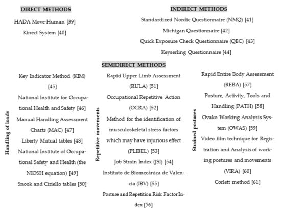 There are numerous methods for assessing MSDs. These differ according to the means available to the assessors—from very sophisticated methods that are dependent on sensors (infrared, ultrasound, etc.) to simple questionnaires. A classification of the most common methods has recently been described (Figure 2) [38,39,40,41,42,43,44,45,46,47,48,49,50,51,52,53,54,55,56,57,58,59,60,61].